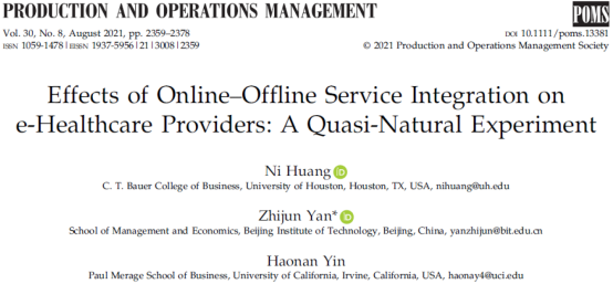 近日,bw必威西汉姆联官方网站管理与经济学院颜志军教授团队在在线医疗服务领域取得重要研究进展,其研究成果《Effects of Online–Offline Service Integration on e-Healthcare Providers: A Quasi-Natural Experiment》以开篇文章(LeadArticle)的形式发表在管理科学国际顶级期刊《Production and Operations Management》2021年第8期,该研究首次在在线医疗领域探索了线上线下渠道整合的影响,验证了线上线下渠道整合对不同类型医生的异质性作用。该项研究工作由颜志军教授团队和美国休斯顿大学NiHuang教授合作完成。