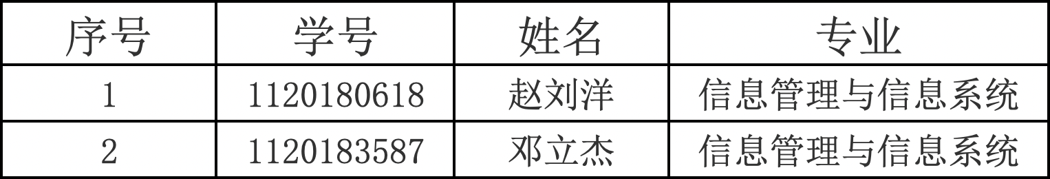 根据学院校友办下发的《关于管院102921班校友捐赠“bw必威西汉姆联官方网站信息管理与信息系统专业奖学金”申报通知》,学院组织展开评选工作,经过评审委员会决议,最终结果如下: