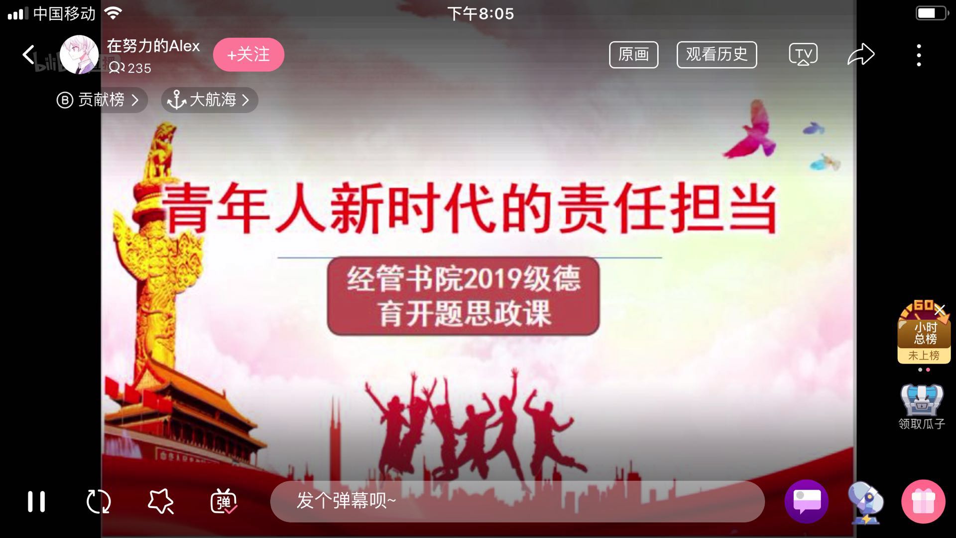 本次在哔哩哔哩网站播放的思政课堂,是学院、书院在疫情期间采取的新型上课模式,受到同学们的广泛好评,播放当天人气值达到3361,在同学们中间引起强烈反响,大家纷纷表示,要把报国之志转化为实际行动,努力成为担当民族复兴大任的时代新人。在奋斗中释放青春激情,用青春书写无愧于时代和历史的新简章!