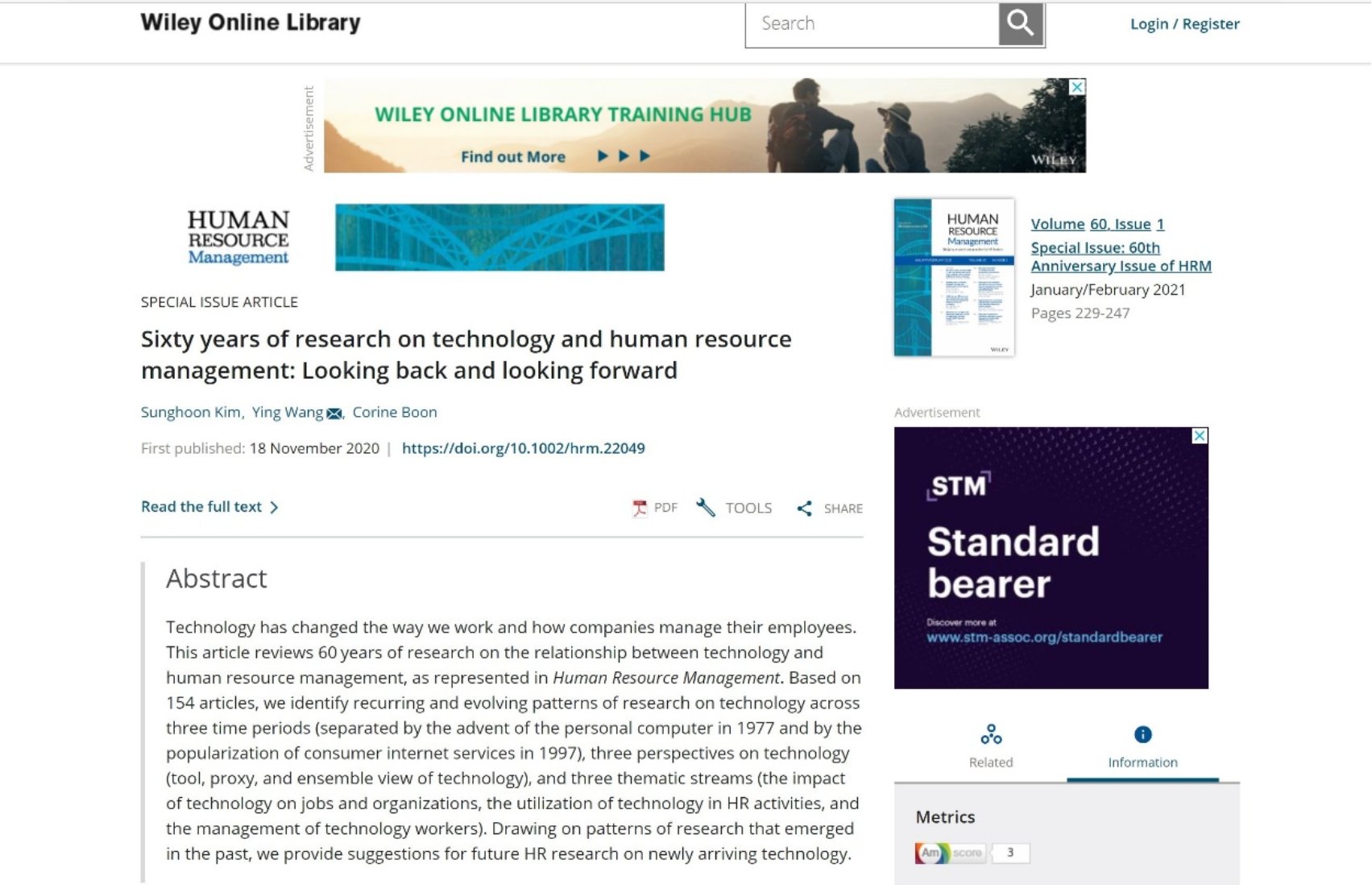 我院王瀛老师与澳大利亚悉尼大学Sunghoon Kim副教授和荷兰阿姆斯特丹大学Corine Boon副教授合作的研究成果“Sixty years of research on technology and human resource management: Looking back and looking forward”近期在《Human Resource Management》期刊发表。王瀛老师为该文的通讯作者。该文获得国家自然科学基金项目资助(71902144)并获得2020中国职业发展论坛暨劳动经济学会职业开发与管理分会优秀论文一等奖。